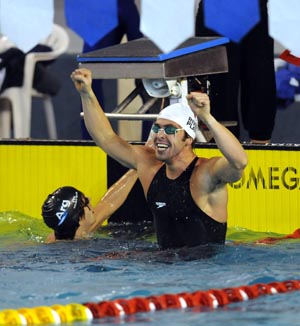 Eduardo German Otero from Necochea and his coach Marcelo "Yuri" Quaglia were the happiest men of the second night of finals when "Edu" hit the pads after swimming 100 meter backstroke and the scoreboard flashed his time of 56.38 that represents a ticket to Beijing.