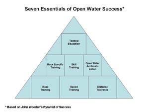 Using Wooden's Pyramid of Success concept, the Seven Essentials to Open Water Success describes the optimal training regimen for a successful open water swimmer, whether the athlete is aiming to do a ½-mile swim for the first time, cross the English Channel or win the Olympic 10K Marathon Swim.
