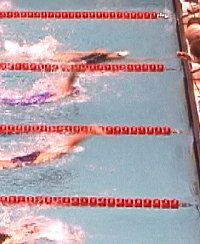 Georgia seems to be on FIRE as Courtney Shealy, swimming in lane 2, stormed from behind to win the 100 Back (58.66), just off the world and American record of 58.50. Catherine Fox, who won this event in 1997 and ’98, and set an American record for 100 yards in prelims last year, jumped out to the lead and turned first at the 50 in 28.51. Fox maintained her lead through the final turn, but then began to fade as Shealy turned on the juice. At the end it was Shealy with her second individual title of the meet, followed by Cal’s Haley Cope (59.17) and Arizona’s Beth Botsford (59.34). Stanford’s Fox was fourth (59.35), her teammate Shelly Ripple fifth (59.56) and Arizona’s Denali Knapp sixth (59.92).