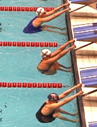 Last December, Arizona's Beth Botsford set an American record of 2:07.36 in the 200m back, the world's fastest time this season. In this morning's prelims she swam a smooth race to qualify first in a solid 2:08.10. Right behind her is defending champion, Keegan Walkley of Georgia, the defending champion, at 2:08.68. Stanford'Shelly Ripple was third in 2:09.69, followed by Arizona's Denali Knapp (2:10.13). Stanford's Misty Hyman, who won this event in 1998 and was second last year, could manage only a 2:12.09, which did not put her in this evening's final.