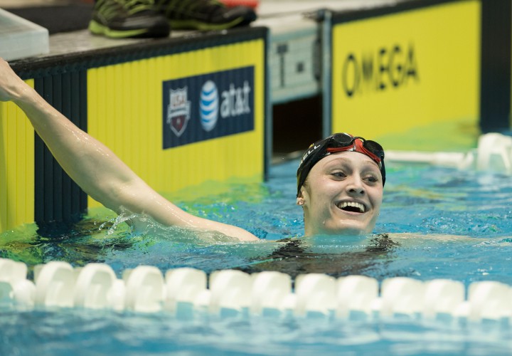The host Cardinals opened the evening session with a victory in the 800-yard freestyle relay. Louisville set a new school and pool record with a mark of 7:08.67. Louisville had to hold off SMU throughout the race, with sophomore Kelsi Worrell getting the squad off to a good start with a school record on her opening split with a time of 1:44.97, touching the wall just .02 seconds faster than SMU’s Nina Rangelova. Andrea Kneppers and Abbie Houck, helped build the lead for Louisville, with Breann McDowell swimming 1:49.06 to clinch the win. Louisville defeated SMU by 2.03 seconds to score the first victory of the event, with Cincinnati finishing third.