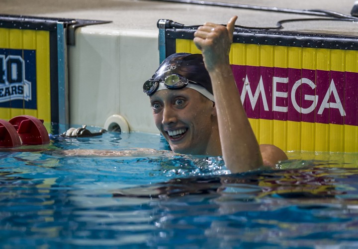 This evening, she realized that potential by blazing her way to a ridiculously fast time of 57.28. She went out in 27.00 and came back home in 30.28. Her 27.00 is the fastest 50-yard breaststroke time ever, just ahead of the 27.09 that Molly Hannis used when she pushed Larson to her previous record of 57.43. The previous top time ever by an American had been a 27.11 from Megan Jendrick.