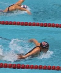 Stanford's Misty Hyman bounced back from a sub-par performance in the 200m back earlier this morning, qualifying first in the 200m fly at 2:10.14. With teammate Shelly Ripple winning the previous heat in 2:10.78, Stanford placed one-three with two swimmers who were doing the difficult 200 back/200 fly double.