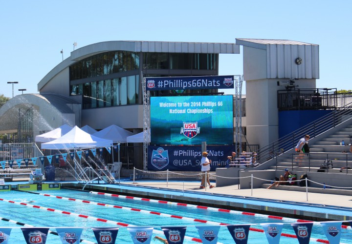 Seriously, can there be a better location for a swim meet? The Woollett Aquatic Center features two outdoor 50 meter pools side-by-side, both under the gorgeous Southern California sky. In six hours in town, I’m not sure I’ve seen a cloud. Sunglasses are a must for coaches, officials, and spectators. During the warm-ups today aerators pumped cold water back into the pool. Expect hot morning sessions and evening finals, but swimmers should have no trouble getting pumped up to swim fast here when crowds fill up the bleachers tomorrow.
