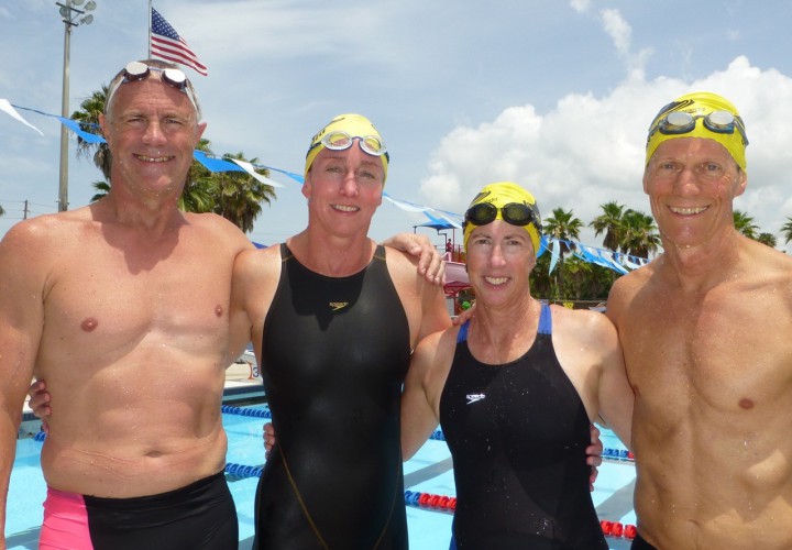 Next up was the 400 mixed freestyle relay, and though he did not surpass his world record swim from the individual race, Groselle’s 58.25 was good enough to help Sarasota with another relay world record. Laura Groselle (1:10.74), Nancy Kryka (1:10.26) and Bob Couch (1:05.20) helped out on the relay to post a 4:24.45 and beat New England Masters’ world record of 4:28.01 from 2012.
