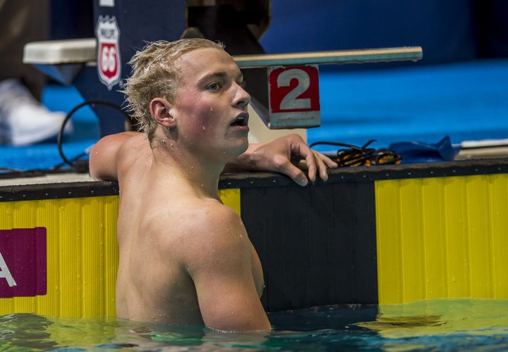 The men’s A final was stacked with talent, like World Junior Teammates Gunnar Bentz and Andrew Seliskar. However, after the first 50 was completed, the race was securely in Seliskar’s hands. Seliskar was a 22.21 after the butterfly, half a second ahead of the field. By the 100 Seliskar had extended his lead to a bodylength, turning at a 47.62. Seliskar was two bodylengths ahead at the 150 with his 1:43.76 split and surged to the finish, touching the wall for the win at a 1:43.76.