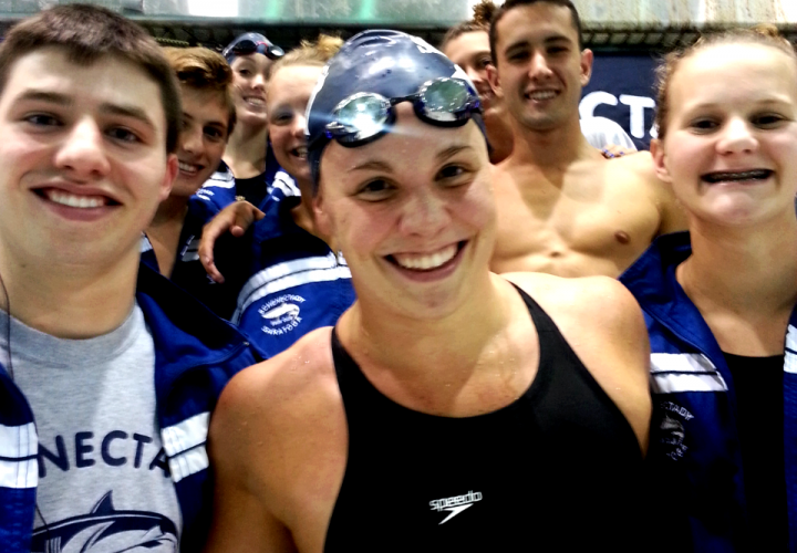 Thus far, the most dominant swimmer of the meet has been Schenectady Sharks’ Kathryn Rowe, soon to be a junior at Penn State who has already three-peated in Buffalo with two more individual races to go. Although she was the second seed coming into finals in the 100-meter butterfly, Rowe closed the gap on her last two strokes just out-touching her competition by four one-hundredths of a second! The crowd was going wild as Rowe hit the pad with a 1:01.91 and Auburn’s Kristen Murslack, 19, with a 1:01.95! University of Virginia’s Shannon Rauth came in a close third with a 1:02.05.