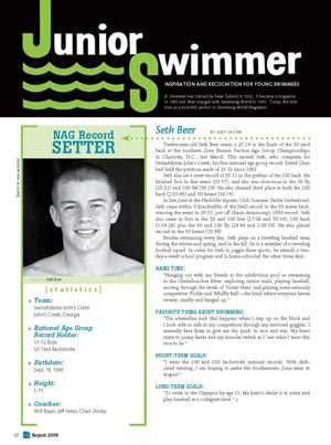 PHOENIX, Arizona, August 10. THIS month's Junior Swimmer section features Seth Beer, of Swim Atlanta's John's Creek, who set his first national age group record in the 50 yard backstroke for boys 11-12. Read about this well-rounded up-and-coming athlete in the Junior Swimmer section of the August Swimming World.