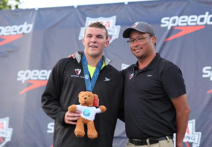 He couldn’t replicate his top time of 4:17.79 from last year’s juniors, but PASA’s Curtis Ogren had more than enough with a 4:18.02 to win the men’s championship finale. He’s likely keeping some of his powder dry for senior nationals next week here in Irvine. Cascade’s Abrahm Devine clinched second-place honors with a time of 4:20.39, while Wilton Y’s Ian Rainey finished third in 4:20.72. CyFair’s Austin Van Overdam nearly made the top three, settling for fourth in 4:20.90.