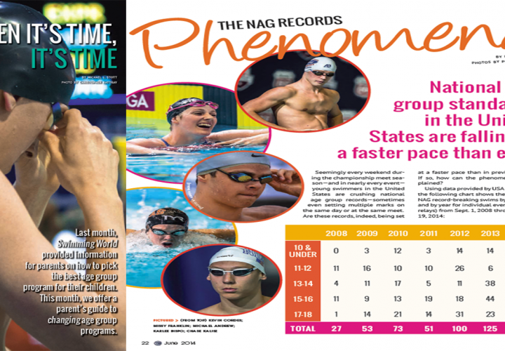 The June 2014 copy of Swimming World Magazine: The NAG Records Phenomena. National age group records in the United States are falling at a faster pace than ever before.