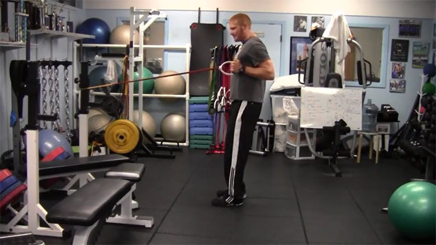 Directions: Wrap the resistance band around a fixed object that allows the band to be stable at mid-torso level. Standing in an athletic position, with your knees bent and chest up, grab both handles in one hand, then pull the band back toward your stomach. Keep your elbows in close to your body. It is important to pull your elbow back past your body without rotating your hips. Picture yourself in a row boat. Slowly return arms to starting position for 10-15 repetitions and two to three rounds.