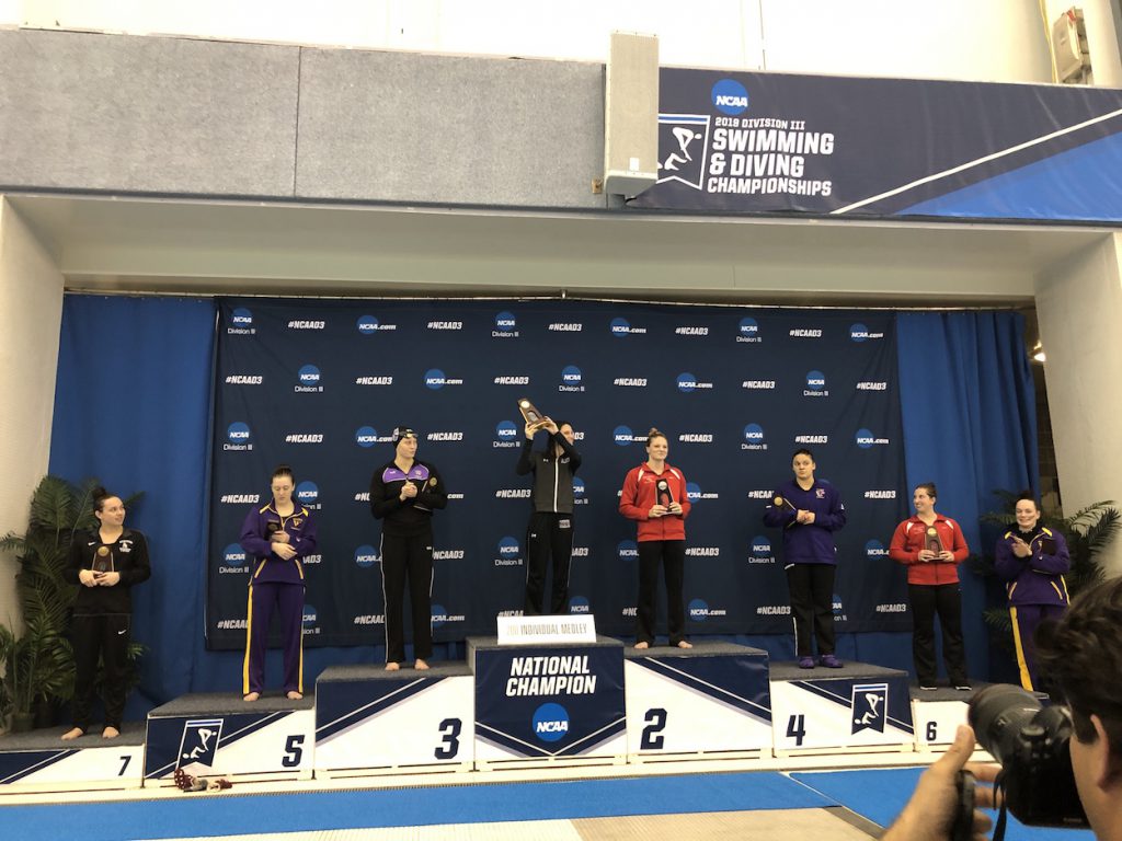 The 2019 NCAA Division III Women’s Swimming and Diving Championship was down to the wire, with Emory beating Kenyon by just nine points. Kenyon and Emory each built their team performances on their depth, as they each had just one of the top ten scorers in the meet. Third and fourth place finishers Denison and Williams each had a duo of the top ten female scorers.