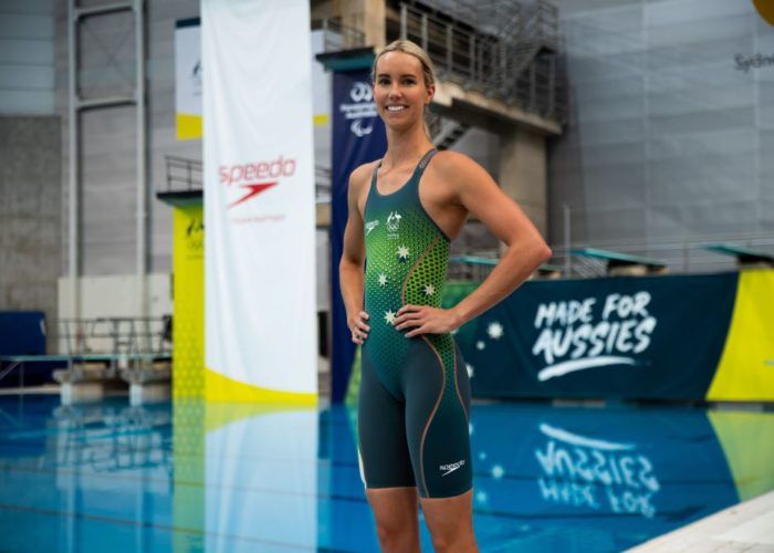 STOOD SND DELIVERED: Emma McKeon proudly models the Speedo Olympic Fastskin racing suit for Tokyo. Photo Courtesy: Speedo Australia.