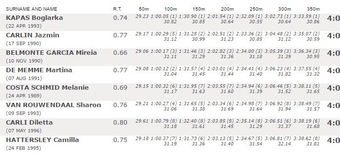 Italy’s Martina De Memme (4:08.19), Spain’s Melanie Costa Schmid (4:09.10), The Netherlands’ Sharon van Rouwendaal (4:09.50), Italy’s Diletta Carli (4:09.51) and Great Britain’s Camilla Hattersley (4:09.51) closed out the finale.