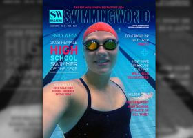 ON THE AUGUST 2018 COVER OF SWIMMING WORLD MAGAZINE Yorktown High School’s Emily Weiss has won the 100 yard breaststroke three straight years at the Indiana High School State Championships.
