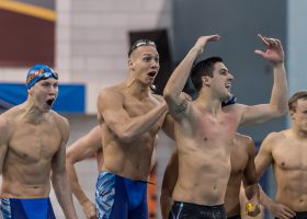 The University of Florida Gators earned themselves a victory in the 4×50 free relay with an American record lead-off split from Caeleb Dressel (17.81). The rest of the squad, Jan