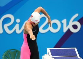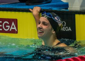 Riptide’s Regan Smith broke Kirsty Coventry‘s pool record of 59.42 by swimming a 59.38, which solidified Smith as the only swimmer to break the 1:00 barrier. Taylor Ruck earned silver in 1:00.18 while the bronze
