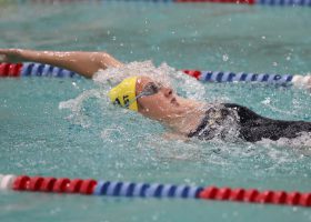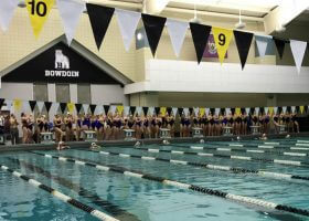 Saturday at a quad meet between Division III NESCAC teams Bowdoin College, Colby College, Trinity College, and Wesleyan University, the women’s teams from each school marched and swam to recognize the Women’s