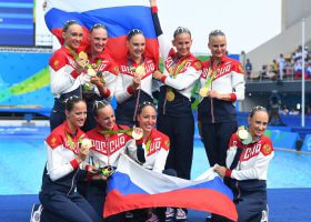 Russia claimed the nation’s fifth straight synchronized swimming team gold medal this afternoon in Rio. The “Angels” free routine scored 99.1333 points. The team’s final score, including Thursday’s technical routine,