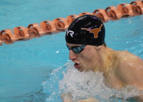 Longhorn’s Andrew Wilson touched out Kevin Cordes for the men’s 100-meter breast win at the 2016 Arena Pro Swim Series Austin. Wilson hit the wall in 1:00.42, well off his