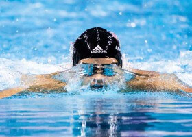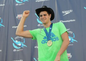 Michael Andrew turned in his third and fourth record-breaking performances of the 2015 USA Swimming Winter Junior Nationals West with a sizzler in the men’s 100-yard fly. He also downed