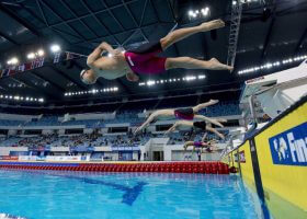 Prelims of day two of the FINA World Cup stop in Dubai kicked off with some fierce competition in the women’s 100-meter free. Federica Pellegrini of Italy holds a narrow lead