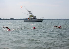 As anticipated, 53-year-old Penny Palfrey of Seventeen-Seventy, Queensland, Australia, handily won the 8-mile Boston Light Swim across Boston Harbor yesterday with a time of 2:56:48. The win adds to Palfrey’s