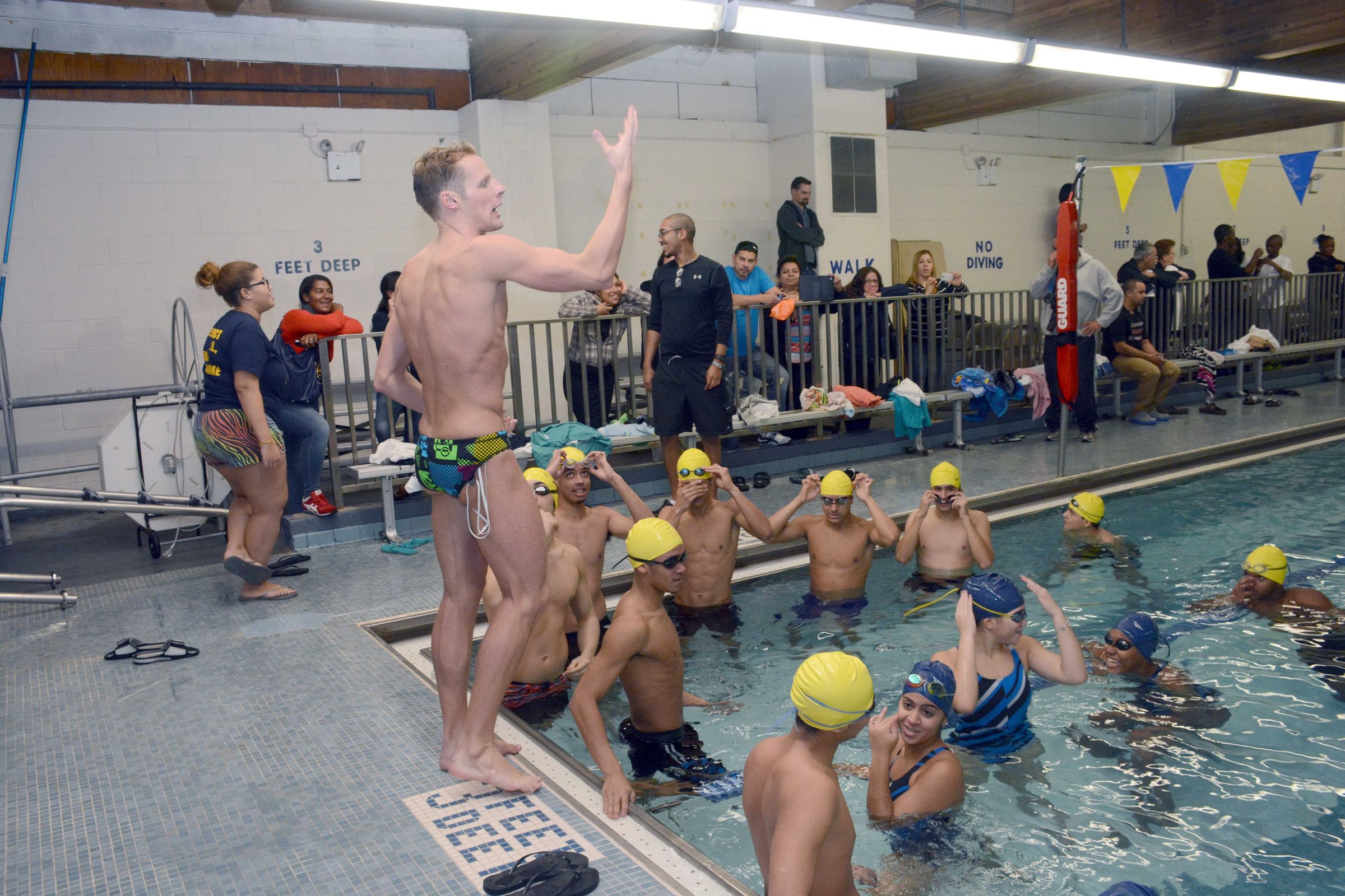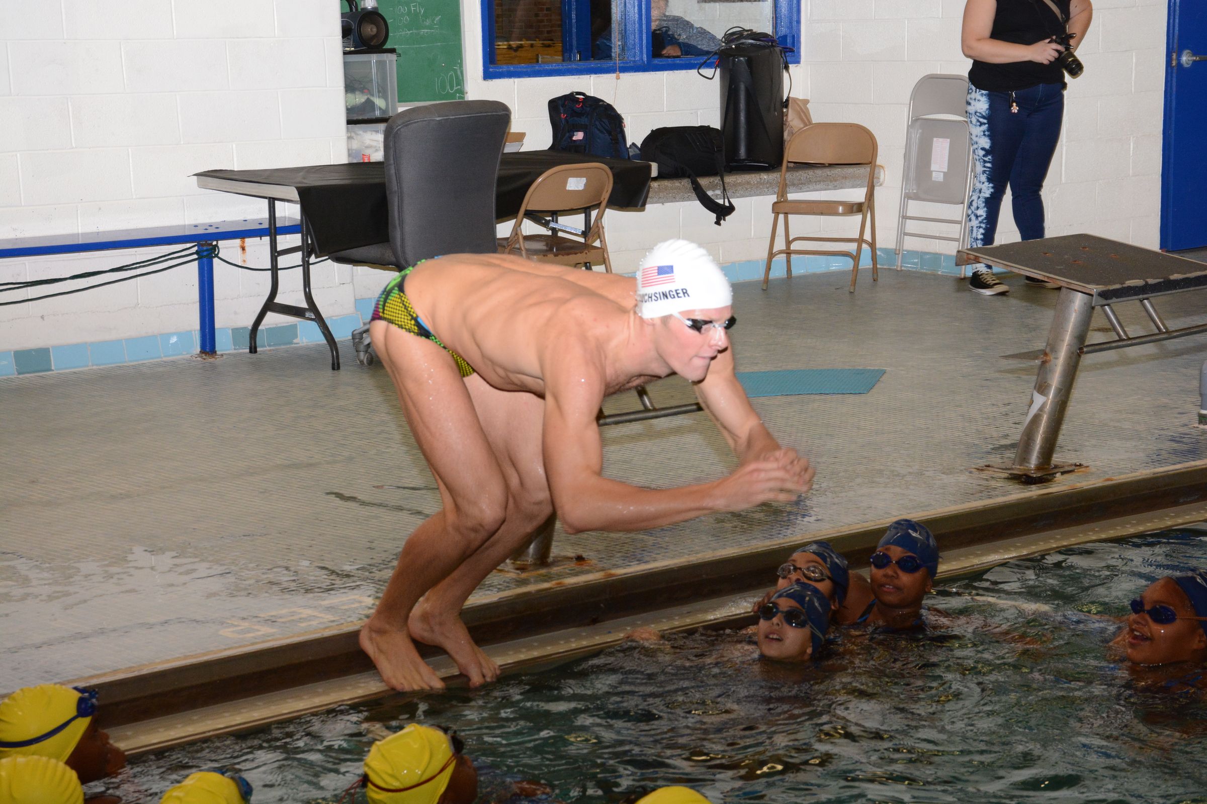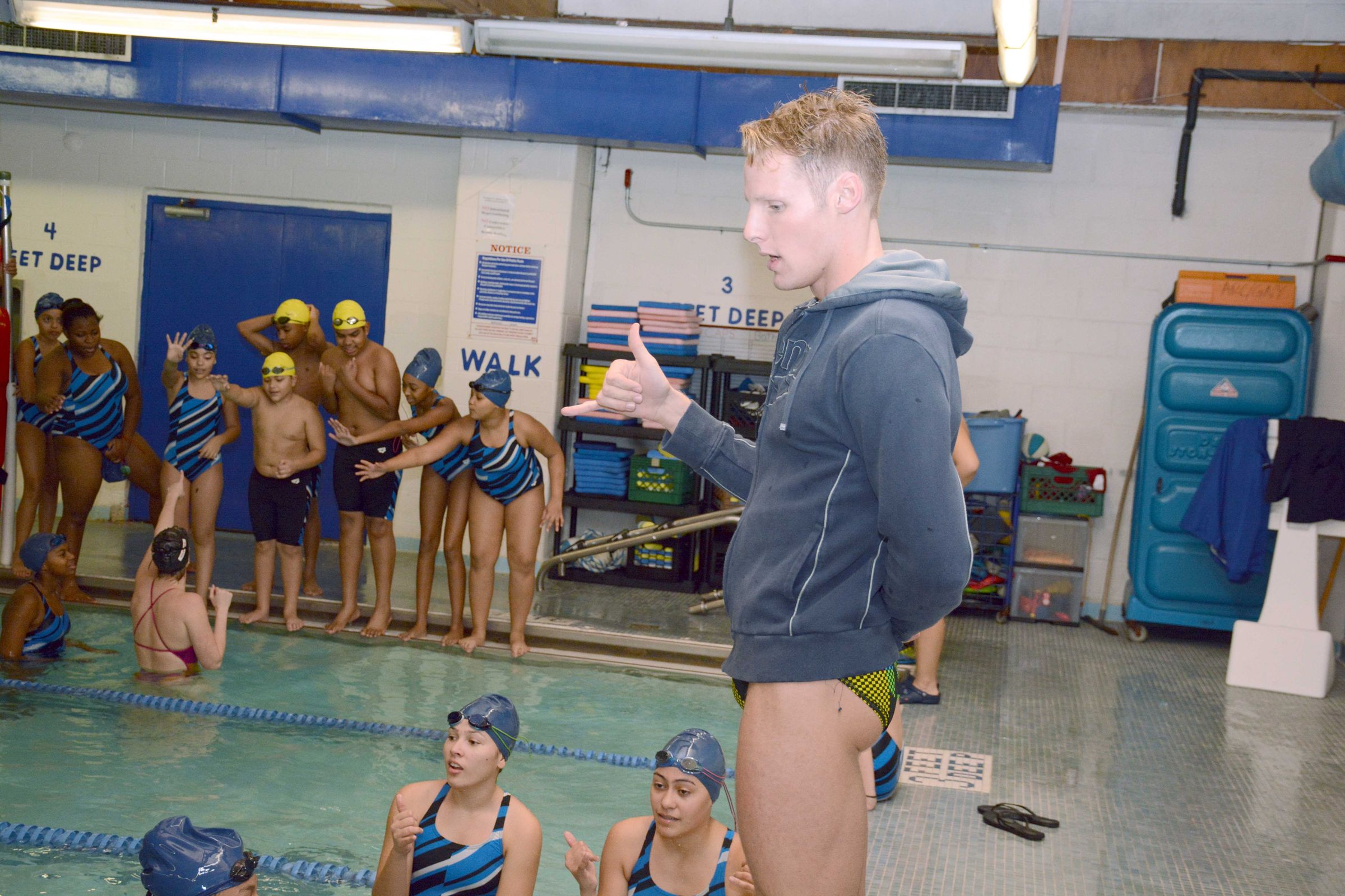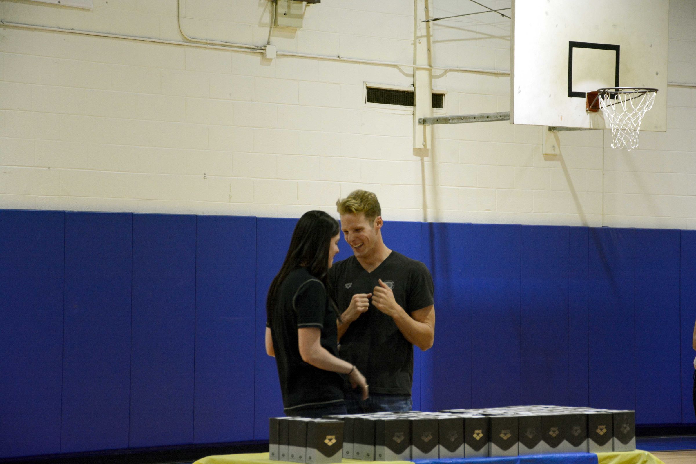 During the event, Arena athletes Cammile Adams, Connor Jaeger and Tom Luchsinger all took part in a swimming clinic, while Breeja Larson joined the trio during a gift-giving ceremony that included Santa Jaeger.