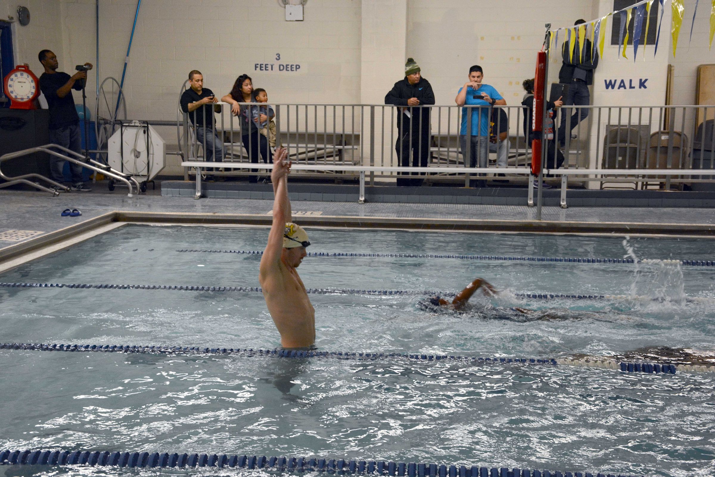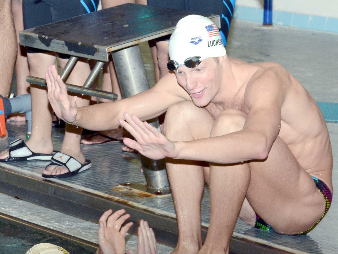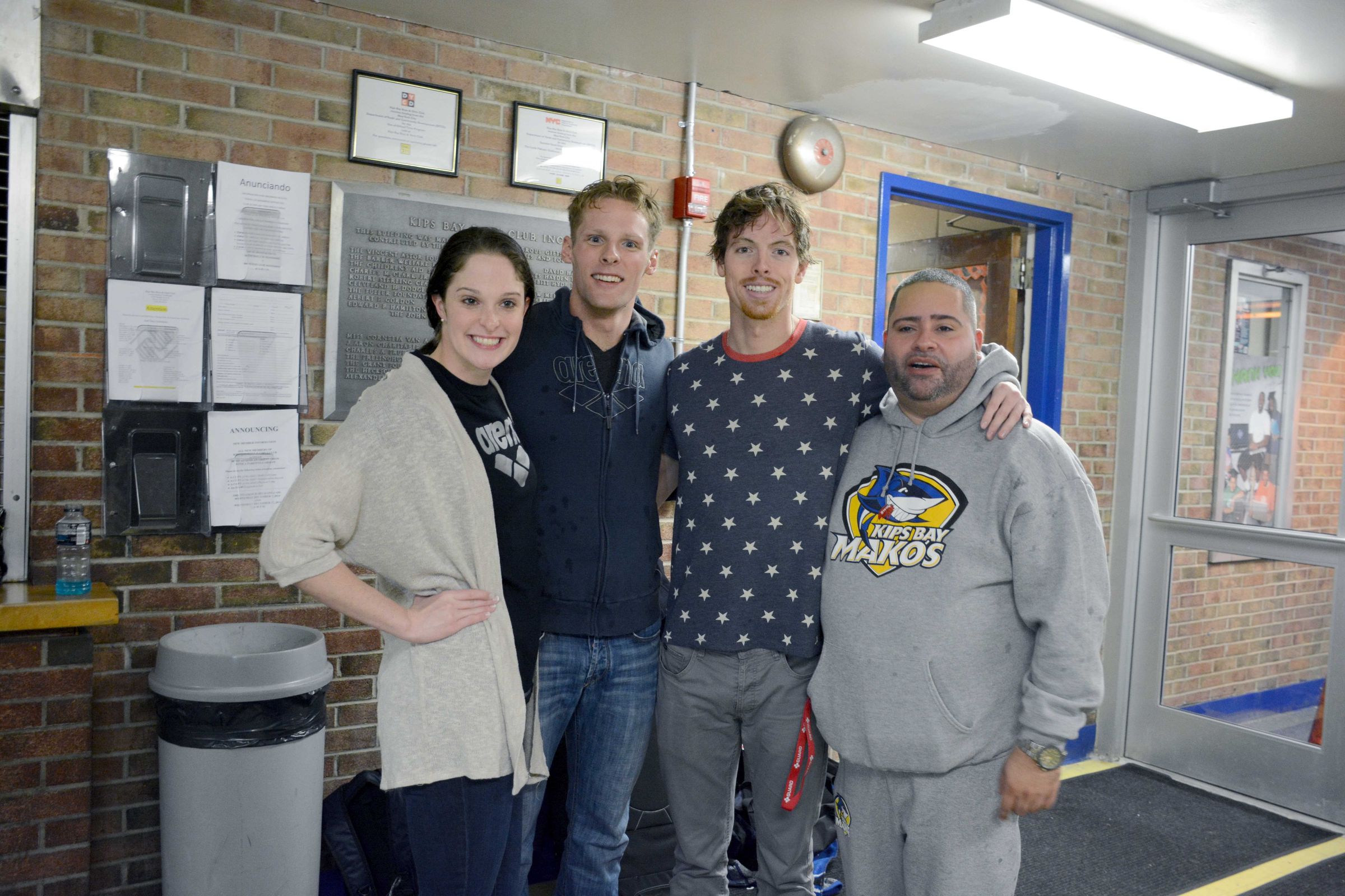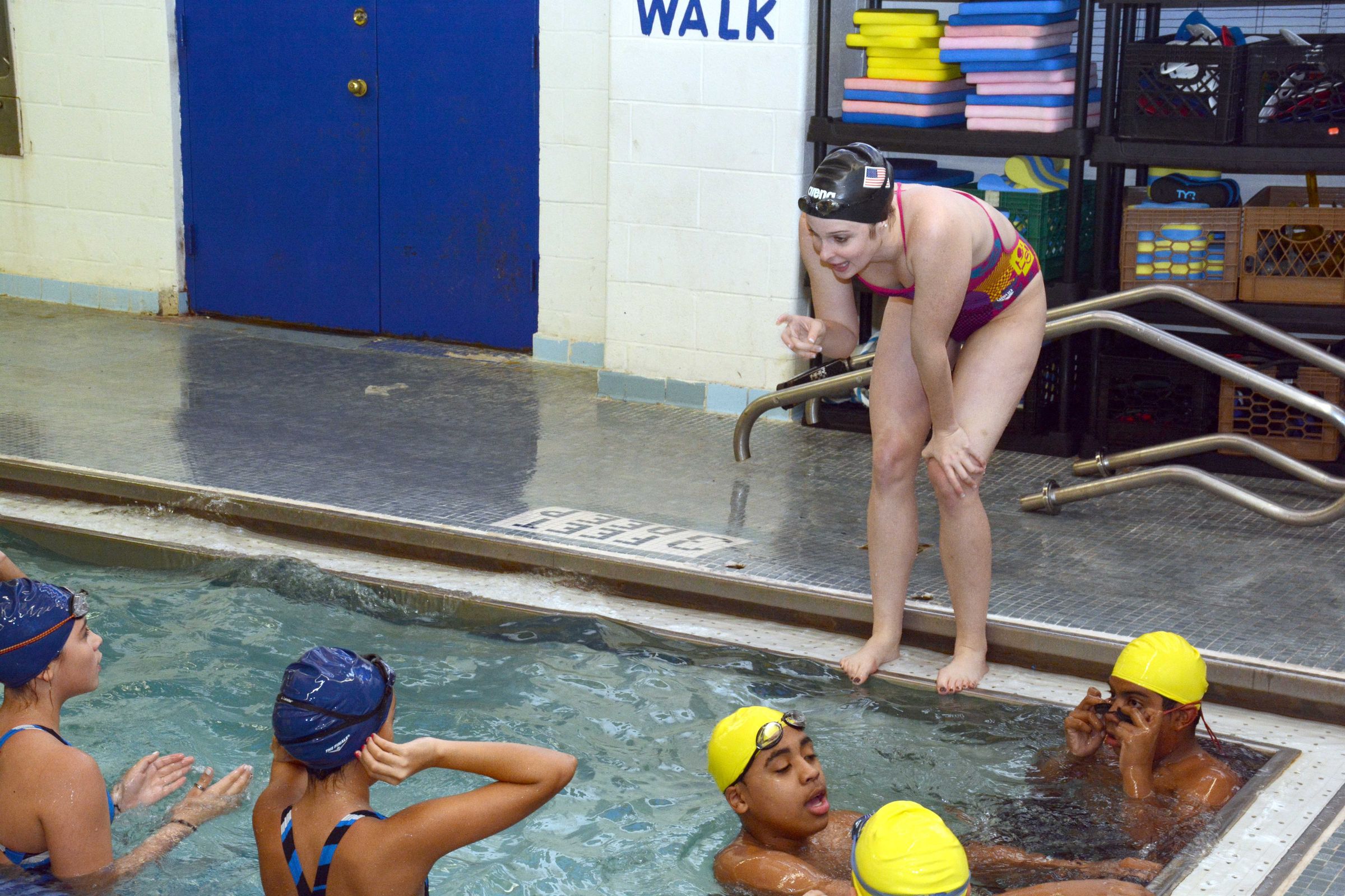 During the event, Arena athletes Cammile Adams, Connor Jaeger and Tom Luchsinger all took part in a swimming clinic, while Breeja Larson joined the trio during a gift-giving ceremony that included Santa Jaeger.