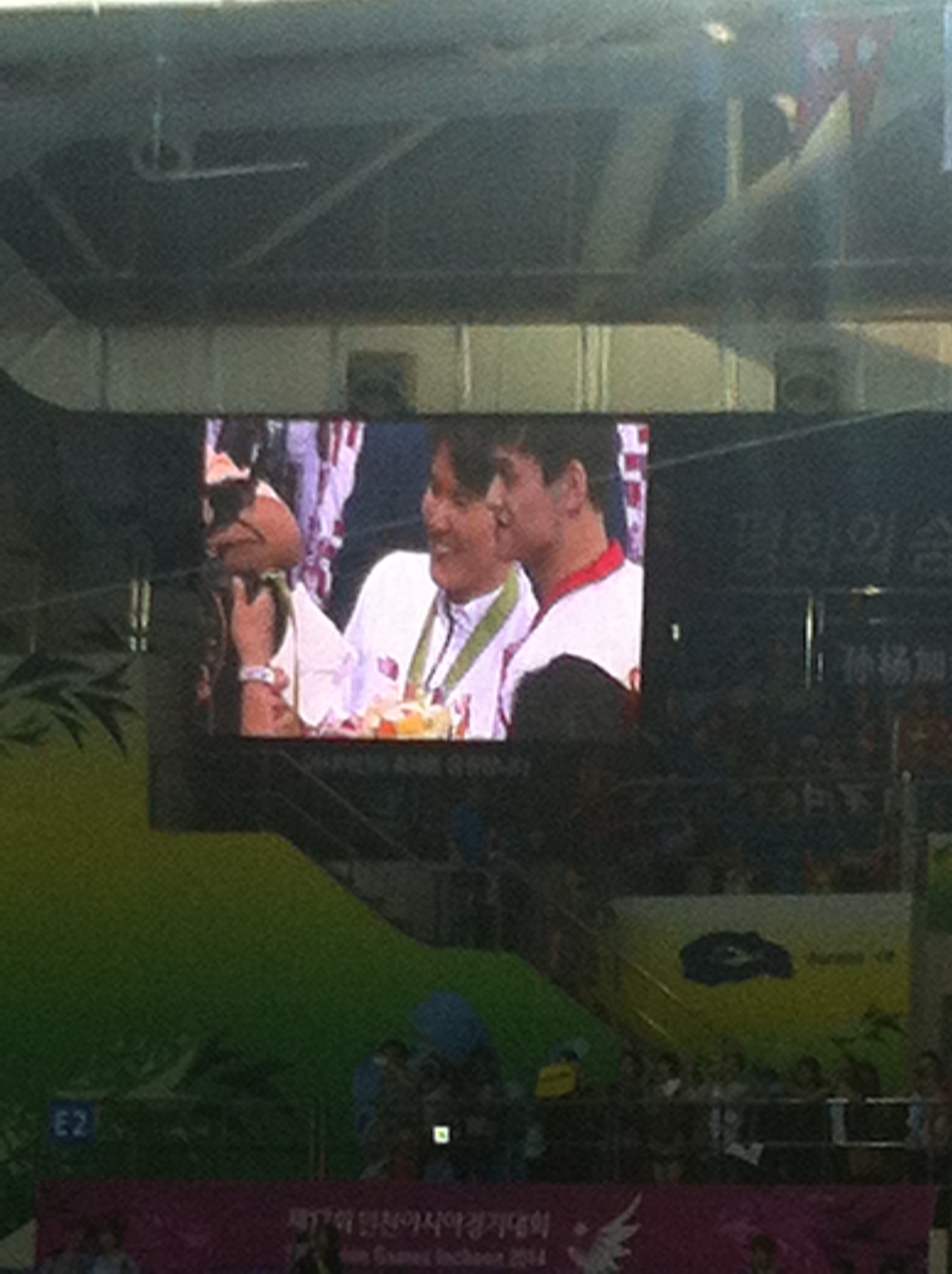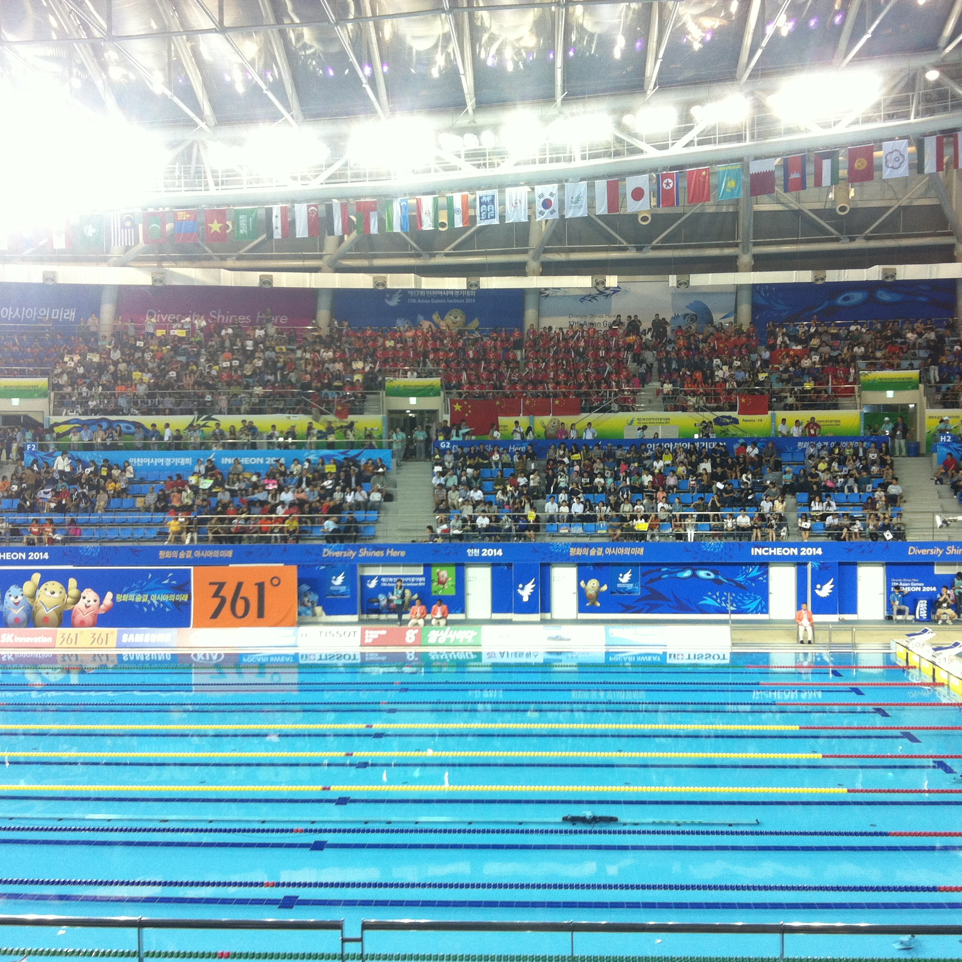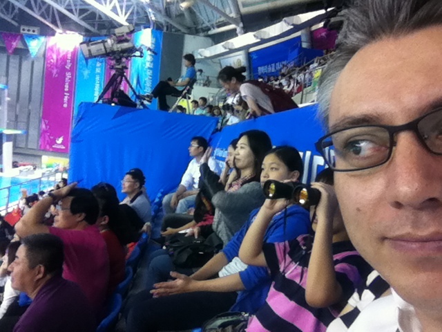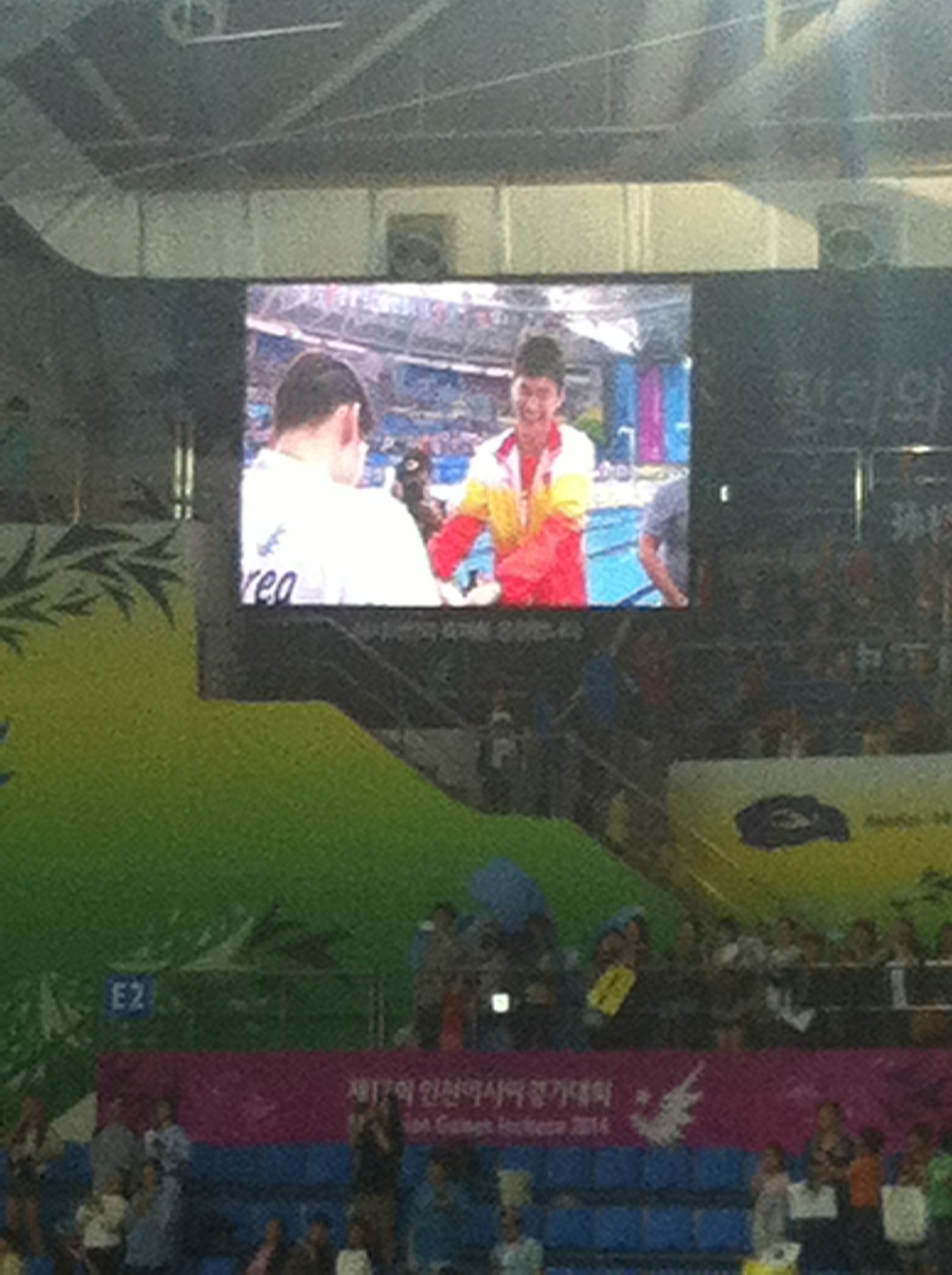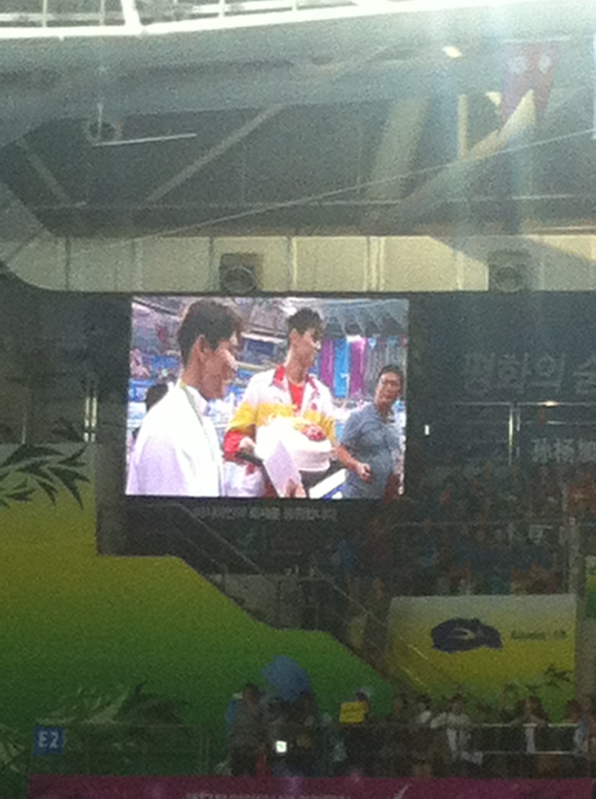 The Chinese have the largest population of expats living in Korea with about 10 million total, and they came out in force the final day of the Asian Games swimming portion. A sea of Chinese red was plastered across the pool’s upper deck. Korea, the hometown crew, came out below them with even a smaller Japanese fan turnout sprinkled among them, but not nearly as color coordinated as the Chinese fan-faithful.