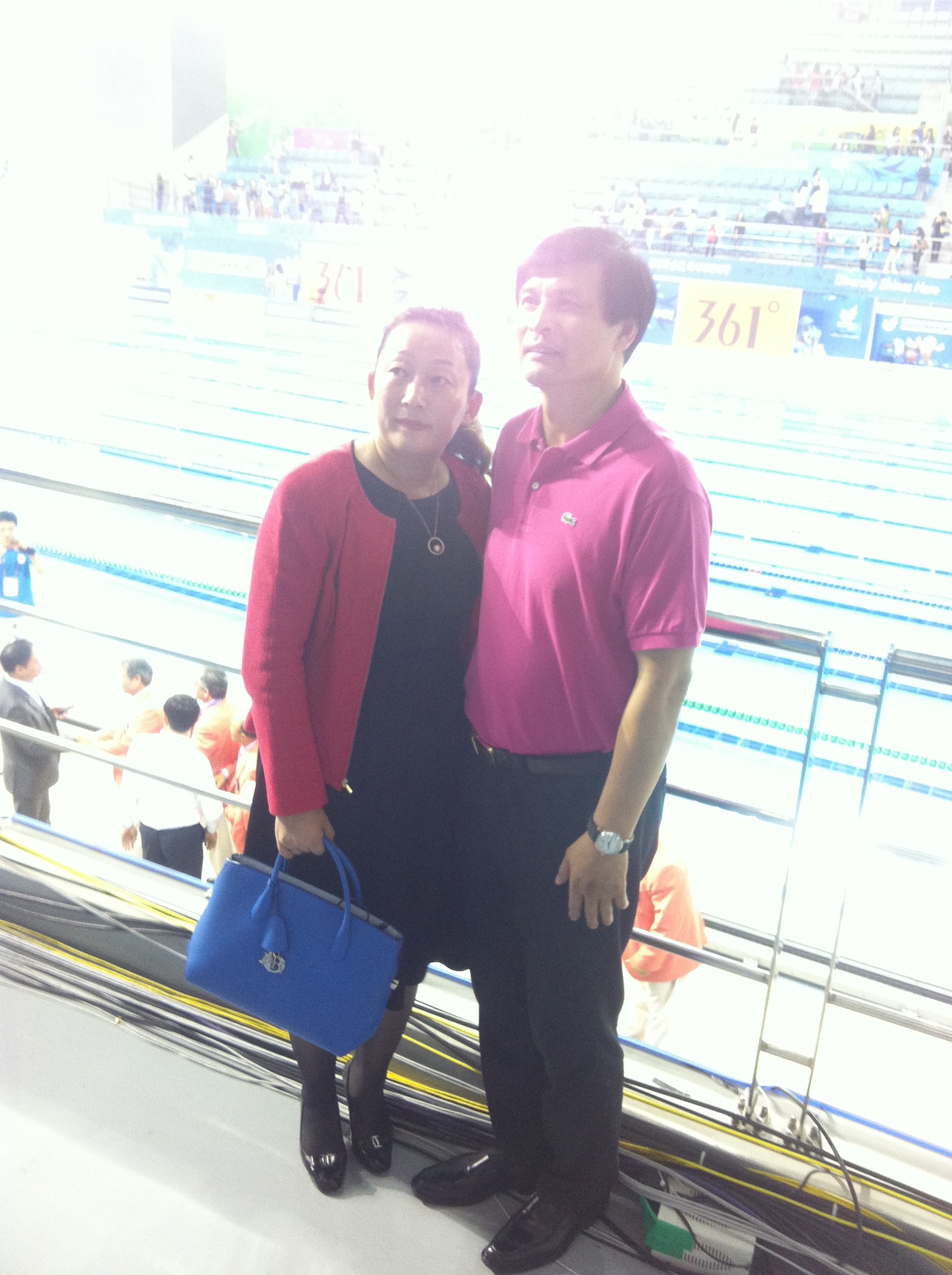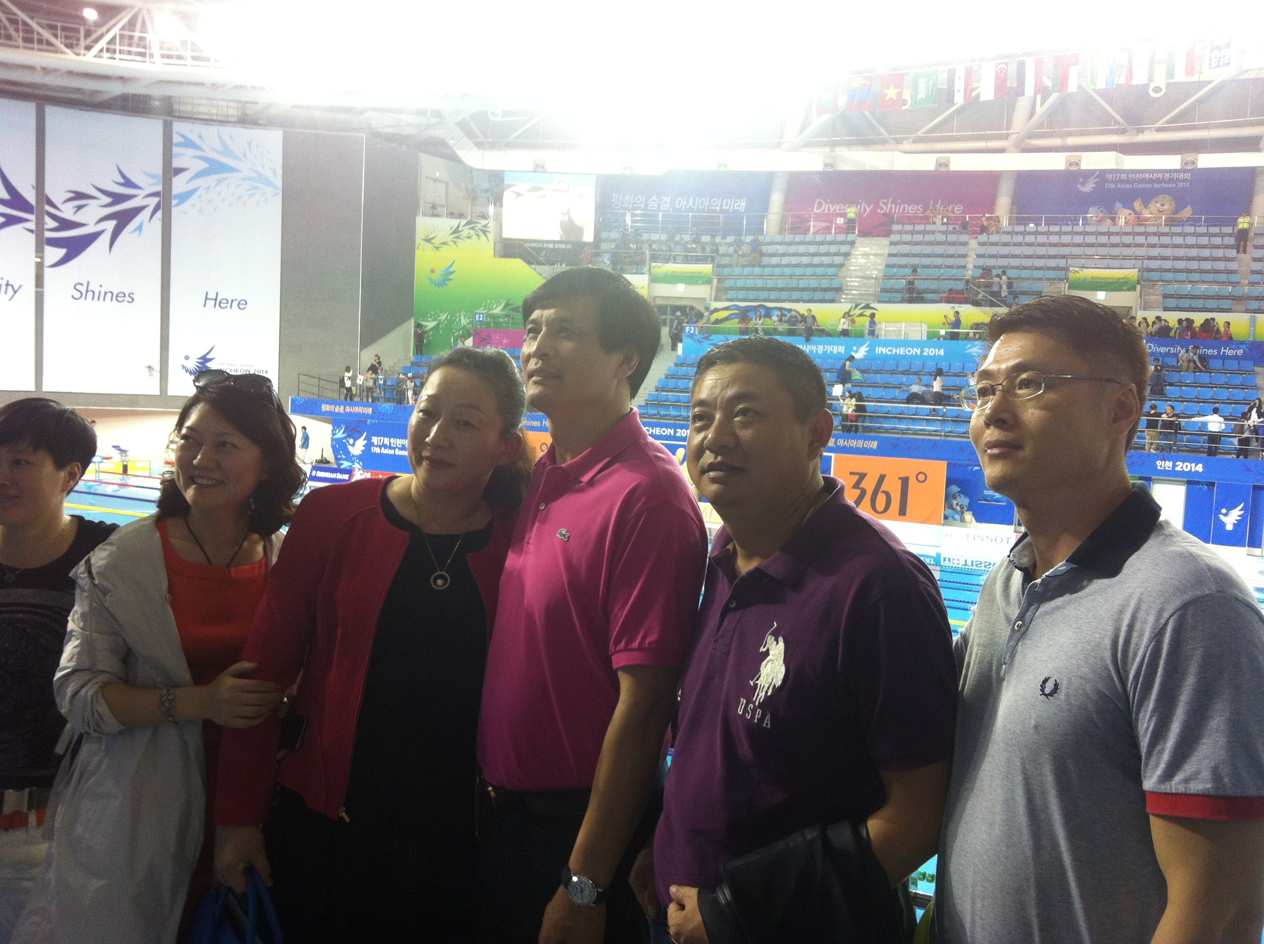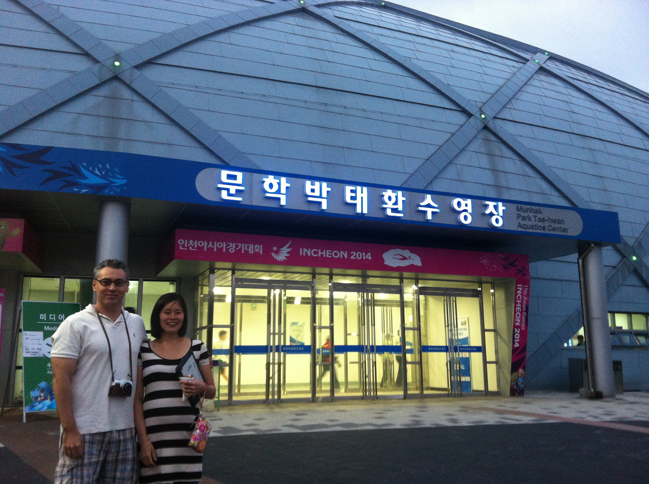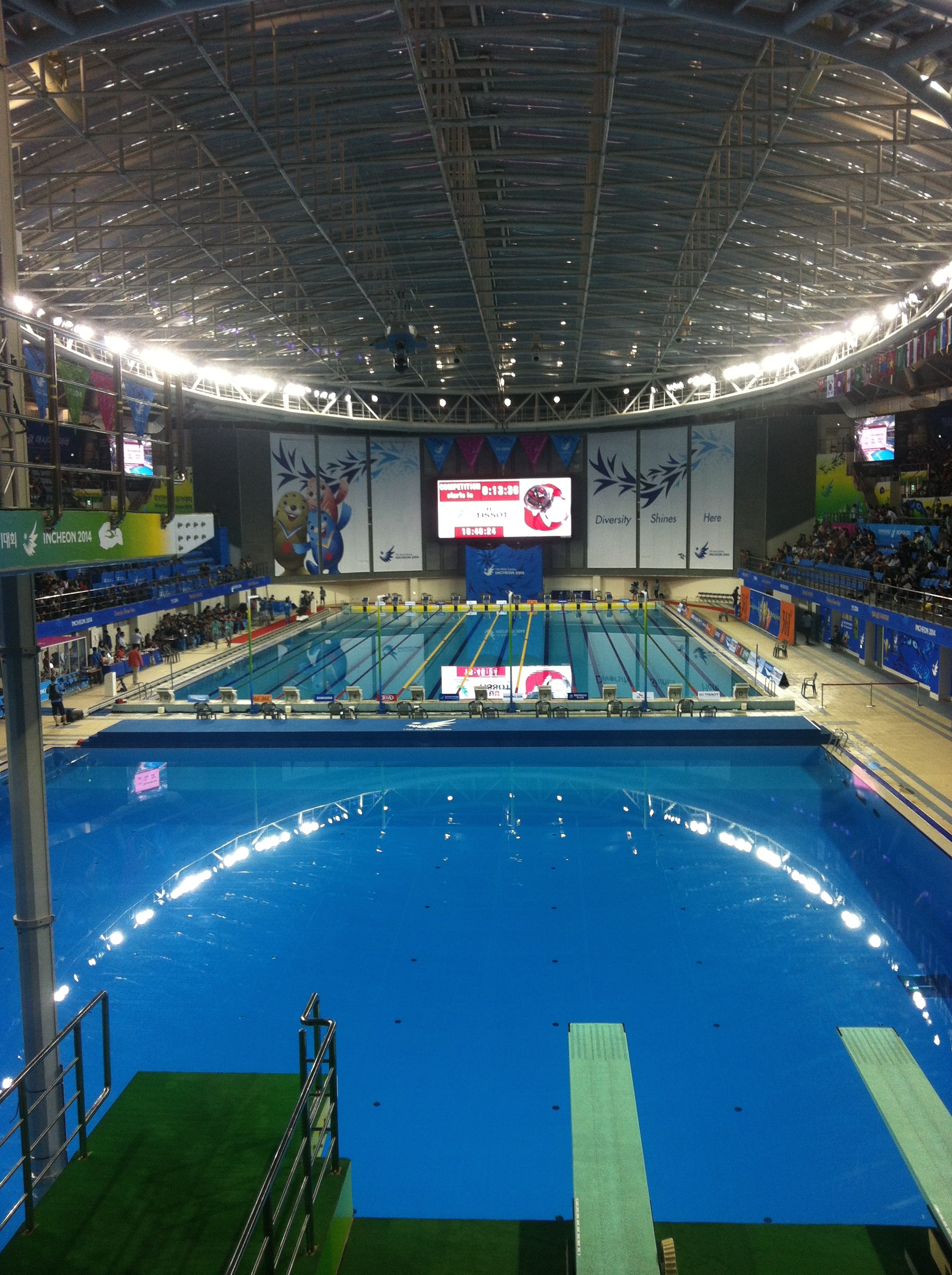 The Chinese have the largest population of expats living in Korea with about 10 million total, and they came out in force the final day of the Asian Games swimming portion. A sea of Chinese red was plastered across the pool’s upper deck. Korea, the hometown crew, came out below them with even a smaller Japanese fan turnout sprinkled among them, but not nearly as color coordinated as the Chinese fan-faithful.
