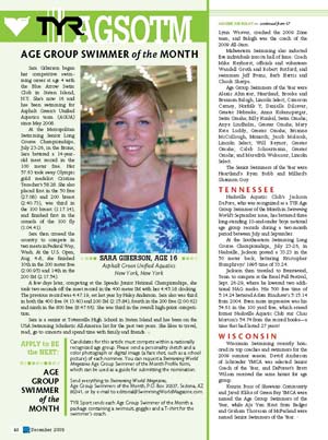 PHOENIX, Arizona, December 14. SARA Giberson, of Asphalt Green's Unified Aquatics, won Swimming World's TYR Age Group Swimmer of the Month for the December issue.