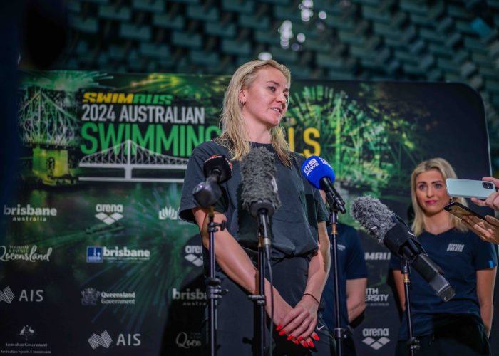 PRESSING TIMES: Ariarne Titmus surrounded in Brisbane. Photo Courtesy Wade Brennan (Wade’s Photos).