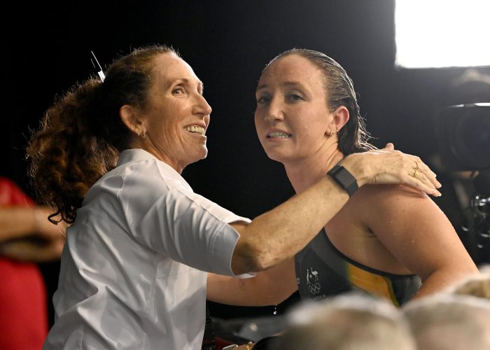 THAT’S MY GIRL: Mum Janelle Elford (Pallister) herself a Seoul Olympian congratulates daughter Lani after her epic 400m freestyle win. Photo Courtesy Delly Carr (Swimming Australia).