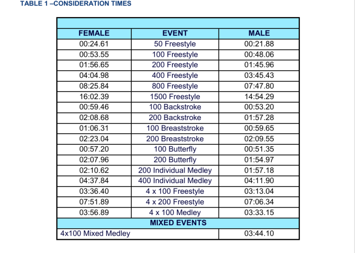 Athletes that finish second in a time equal or better than that in the table will be considered for selection to a team that will have a maximum of 30 athletes.