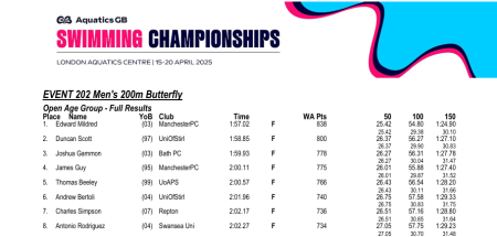 Ed Mildred soared to a new PB in the 200 fly as he booked lane four alongside Duncan Scott who was making his first appearance of the 2025 Aquatics GB Swimming Championships in London.