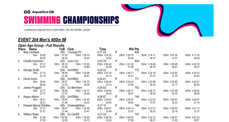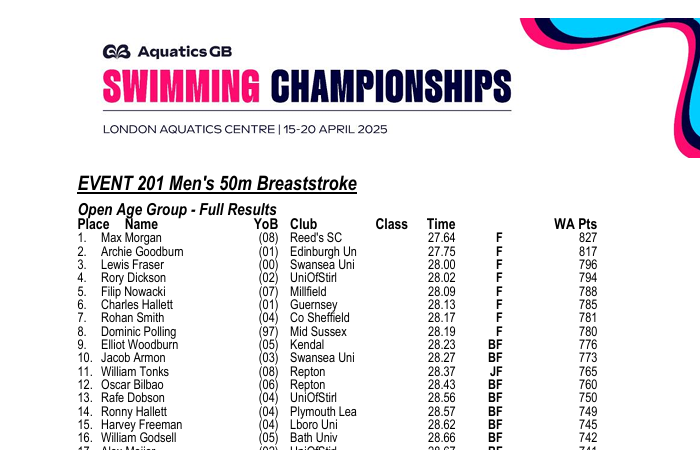 Max Morgan returned from winning silver in the 100 in a 17-years age group record of 1:00.10 to post the top time over one length of 27.64, again lowering the age group mark. Archie Goodburn was the other man inside 28secs in 27.75 with Lewis Fraser third through in 28.00.