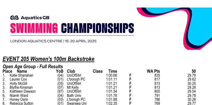 The final promises to be a corker with Katie Shanahan – who was fifth in the 200 back in Paris – leading the way in 1:00.66. It was a PB for the University of Stirling swimmer who has only recently decided to take up the two-length event after putting the 400IM on the back burner for this season as she wasn’t enjoying it the past few years. Lauren Cox was next swiftest in 1:01.11 with Holly McGill and Blythe Kinsman both on 1:01.21 and European record-holder Kathleen Dawson through in 1:01.54.
