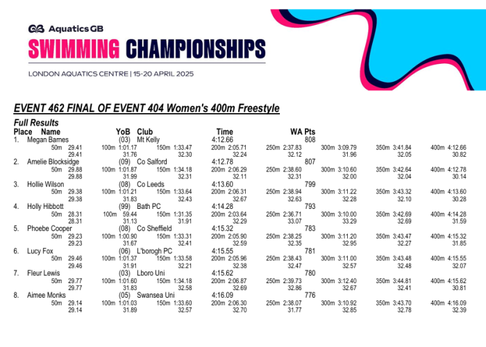 A thrilling race where the lead changed hands saw Megan Barnes prevail in 4:12.66 following a stroke-for-stroke battle down the final 50 with Amelie Blocksidge. Blocksidge added 400 silver to her 1500 title in 4:12.78 with Hollie Wilson third in 4:13.60.
