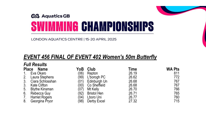 Okaro won her second title of the meet in London as she touched in 26.19, a British 18-years age group record. Stephens was second in 26.62 with Kate Clifton and Ciara Schlosshan sharing third in 26.68, the latter setting a Scottish record.