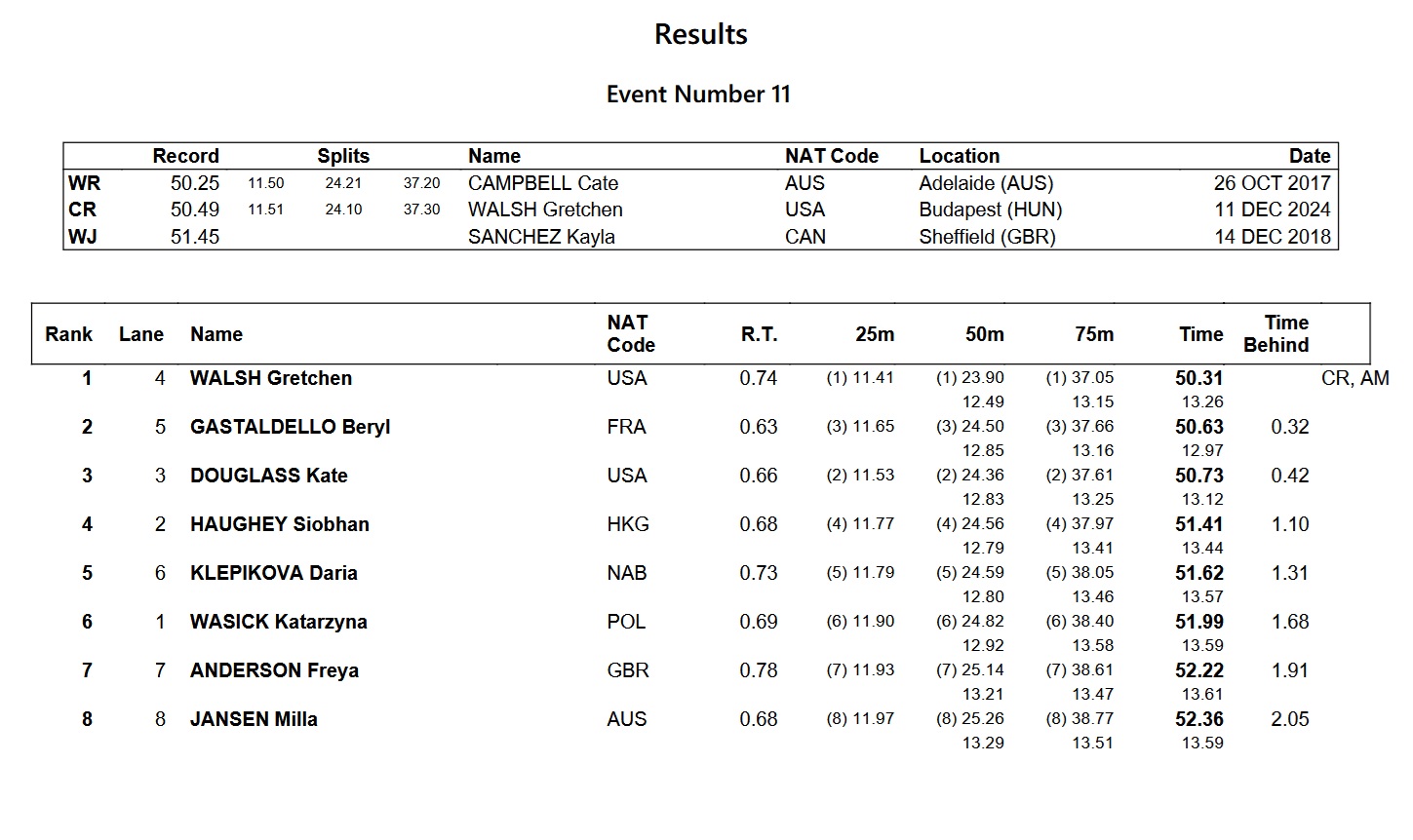 Walsh has been on a tear this winter. She set the meet record in the semifinals by going 50.49. That mark had been held by Emma McKeon at 50.77 from the last edition of the championships in 2022.