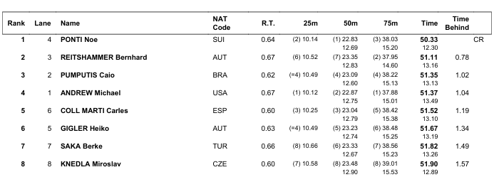Bernhard Reitshammer claimed a rare medal for Austria in second place in 51.11. Caio Pumputis rallied to deny Michael Andrew a spot on the podium by .02.