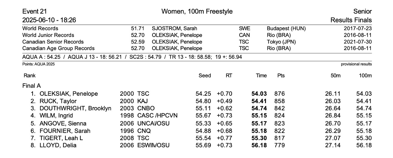 The Olympic co-champion in 2016, Penny Oleksiak nailed down a qualifying time for the World Champs in the 100 freestyle behind a swim of 54.03. Oleksiak was just behind Taylor Ruck at the turn, but moved to the front of the field down the final length, with Ruck placing second in 54.41. Brooklyn Douthwright also dipped under the 55-second barrier, as she touched for third place in 54.74.