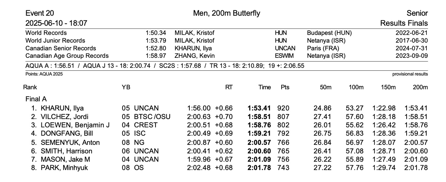 Reigning Olympic bronze medalist Ilya Kharun made a run at his national record before touching the wall for a convincing triumph in 1:53.41. Kharun holds the Canadian record at 1:52.80, posted at the Olympic Games in Paris, and he pushed the pace during the opening half of the race, going through the first lap in 24.86 and touching at the midway point in 53.27. Kharun made the turn at the 150-meter point at 1:22.98.