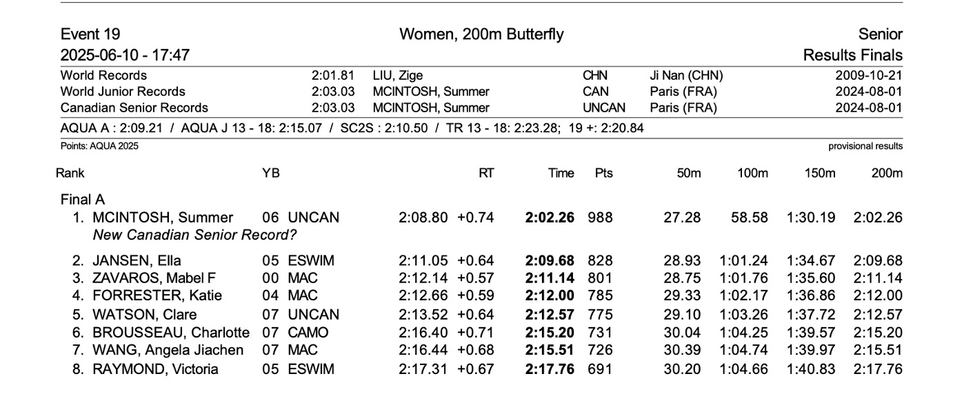 A fourth Canadian record in as many days was managed by Summer McIntosh, as the 18-year-old posted the No. 2 time in history with a mark of 2:02.26. That mark was not far off the world record of 2:01.81, which has been held by China’s Liu Zige since 2009. McIntosh was followed in second place by Ella Jansen, who touched in 2:09.68.