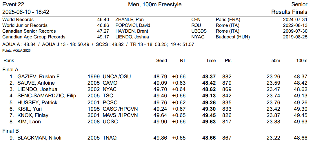 After a year away from the sport serving an anti-doping suspension for a whereabouts violation, Ruslan Gaziev returned to the top of his country’s rankings in the 100 freestyle. Out ahead of the field in 23.26, he held off a hard-charging Antoine Sauve down the stretch by five hundredths, 48.37 to 48.42. Both men were outside of the World Aquatics qualifying time for the upcoming Singapore Worlds, but Swimming Canada is likely to field a 400 free relay.