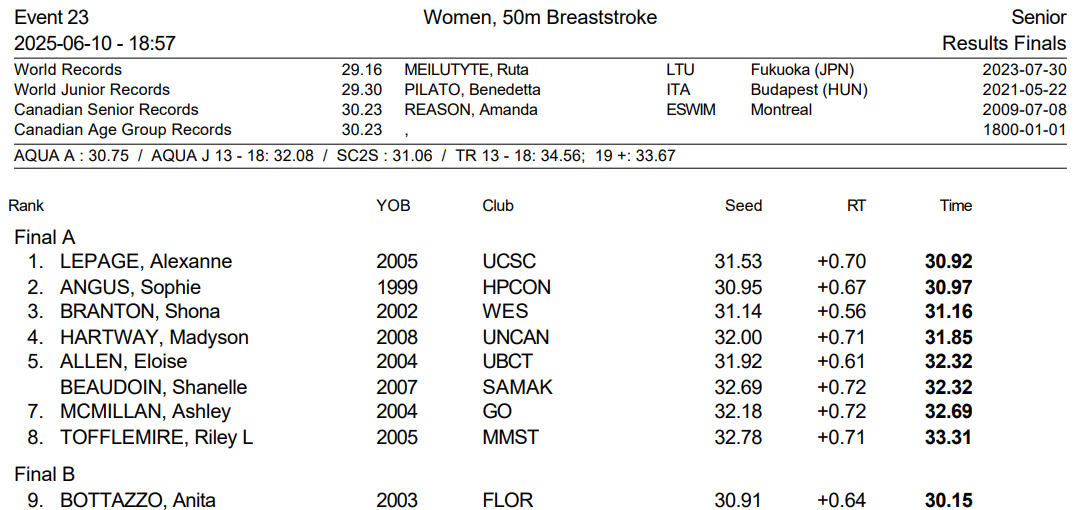 Alexanne LePage added to her earlier victory in the 100 breaststroke by clocking 30.92 for the top spot here, putting her five hundredths ahead of veteran Sophie Angus (30.97). Both swimmers finished outside the qualifying tine, but LePage previously matched the requisite mark in the 100-meter event. Third went to Shoana Branton in 31.16. The top time of the night actually came in the B-final as Anita Bottazzo, an Italian swimming at the University of Florida, jumped to No. 6 in the world with her time of 30.15.