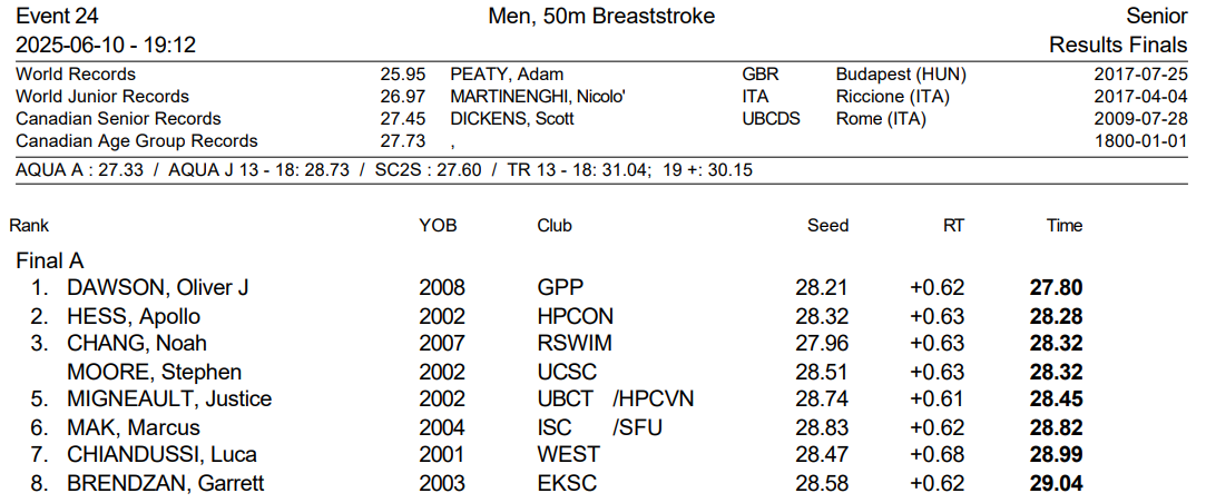 The top-two finishers here repeated their finish from the 100 breaststroke. Teenager Oliver Dawson shined with a time of 27.80, well outside the qualifying time for Singapore but likely good enough to send him to the World Junior Championships. Apollo Hess grabbed second in 28.28, just ahead of a tie for third between Noah Chang and Stephen Moore, with both going 28.32.
