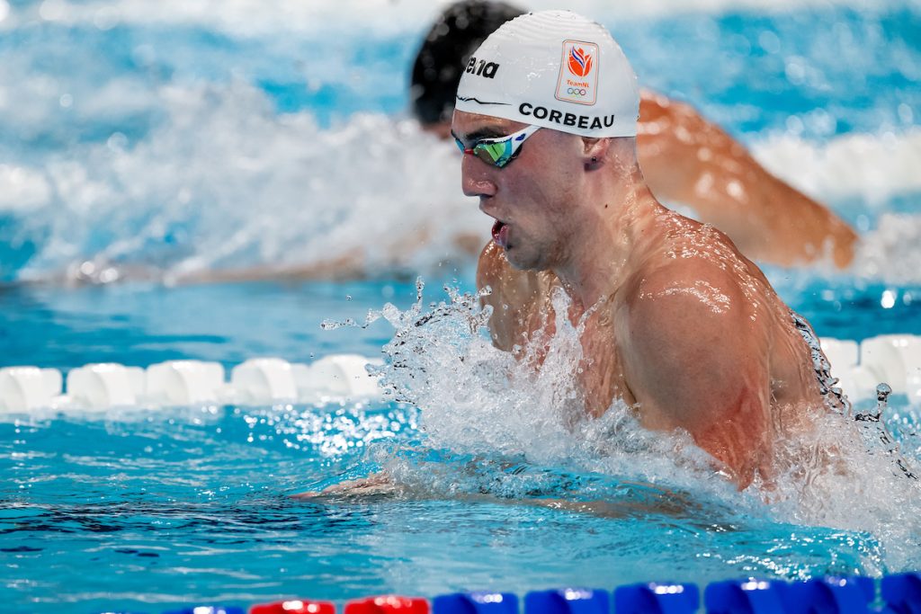 Corbeau – now coached by Mark Faber in Antwerp – returned to head the 50 breast semis in 27.45.