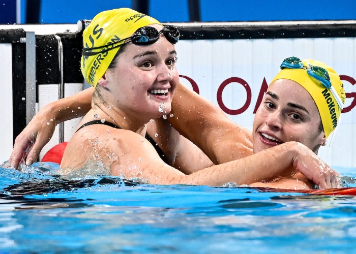 BACKSTROKING TWINS: Iona Anderson and Kaylee McKeown of Australia react after competing in the swimming 100m Backstroke Women Final during the Paris 2024 Olympic Games at La Defense Arena in Paris (France), July 30, 2024.